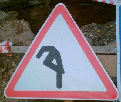 В городе появился новый дорожный знак. Его название Осторожно, срывает крышу!. Знак устанавливается около ночных клубов, дискотек и прочих увеселительных мест, где публика легко уходит в астрал и может неожиданно появиться в состоянии неадекватности на проезжей части.